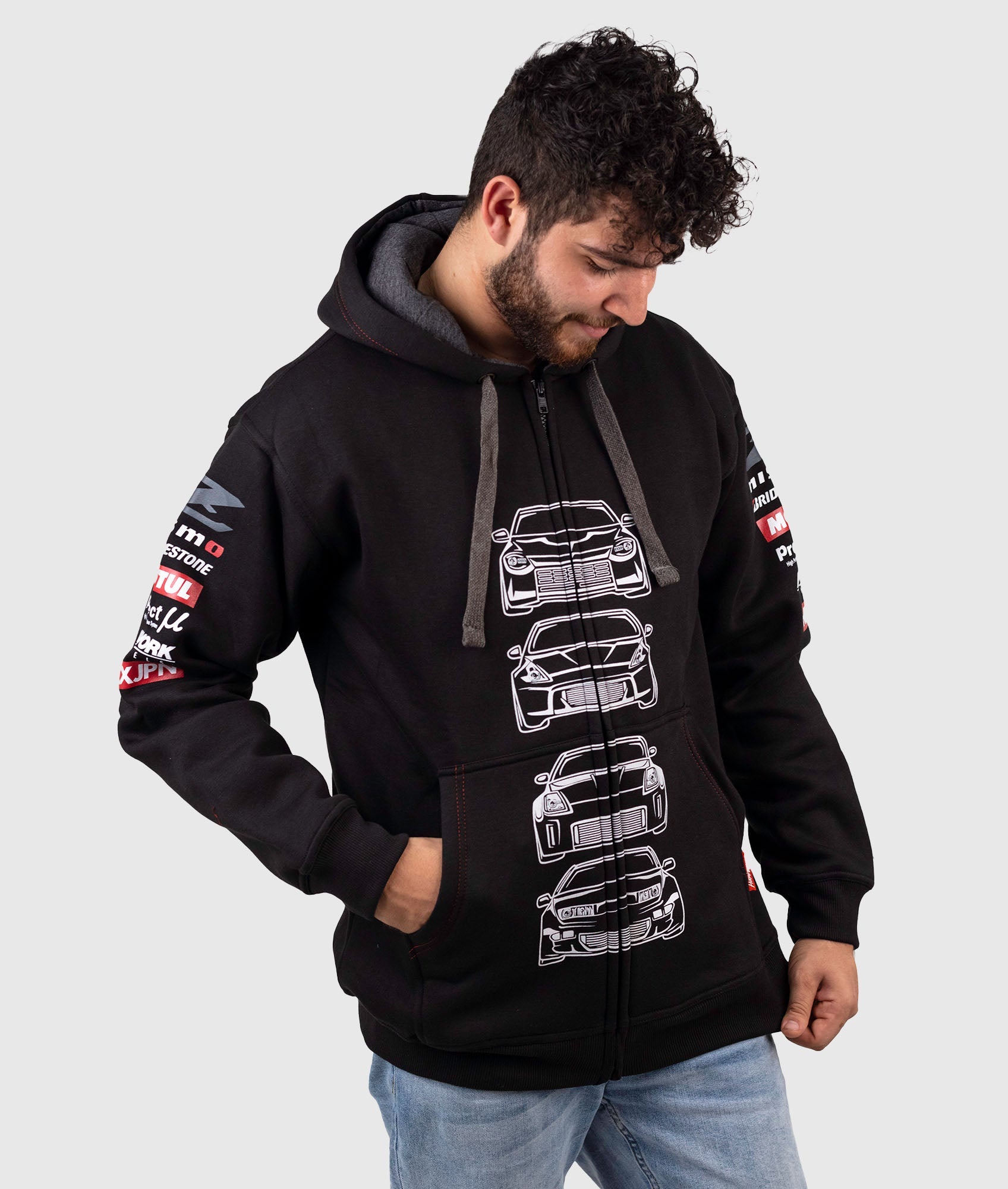 This hoodie is the best way to show off your love for the Z with front ends of each model on the front that line up perfectly with the zip and the rear ends on the the back, it also features extra print on the hood and sleeves for added style.