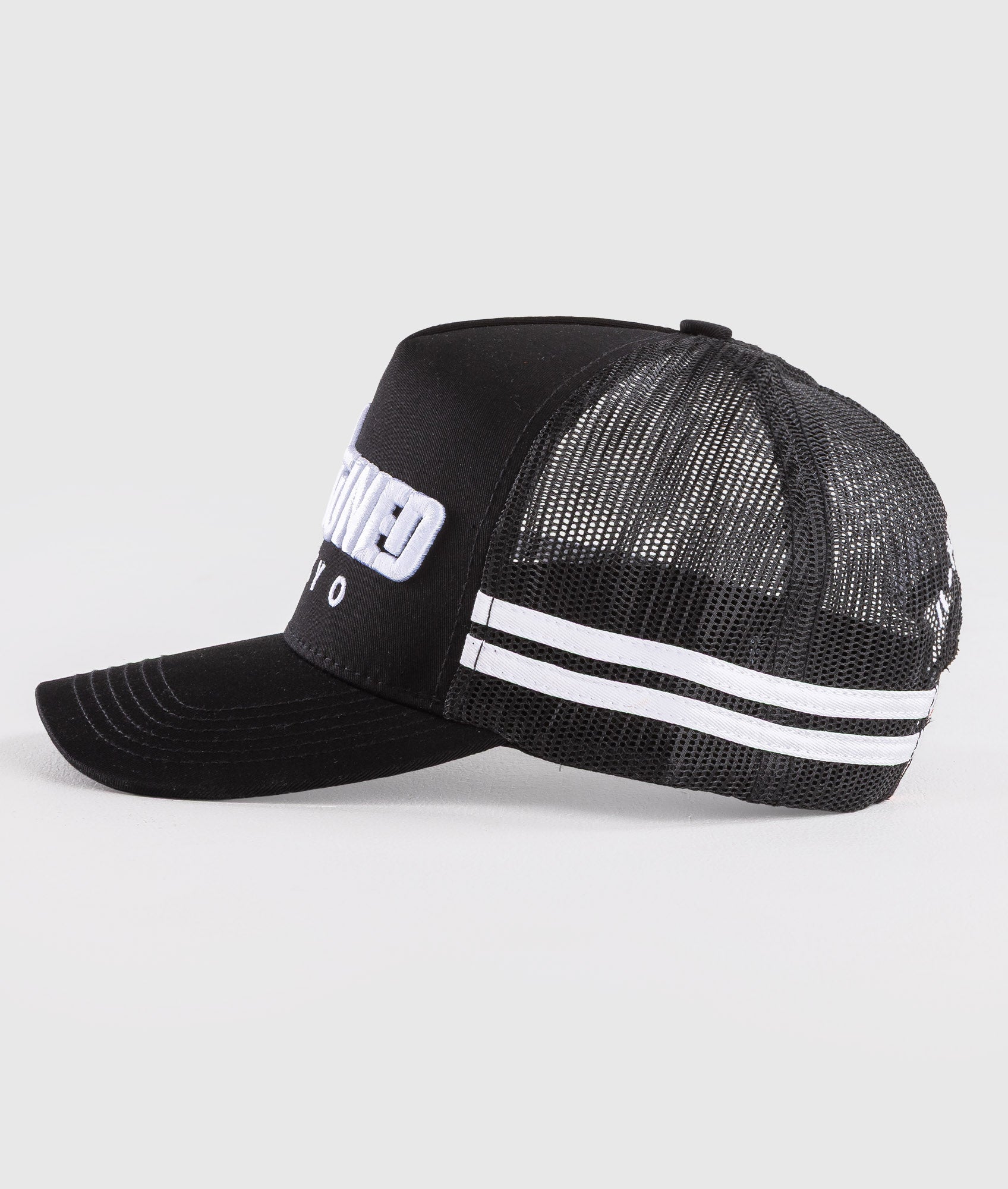 Features a pre-curved brim, custom inner tagging, and a mesh panel on the rear with bold white strips on the sides.