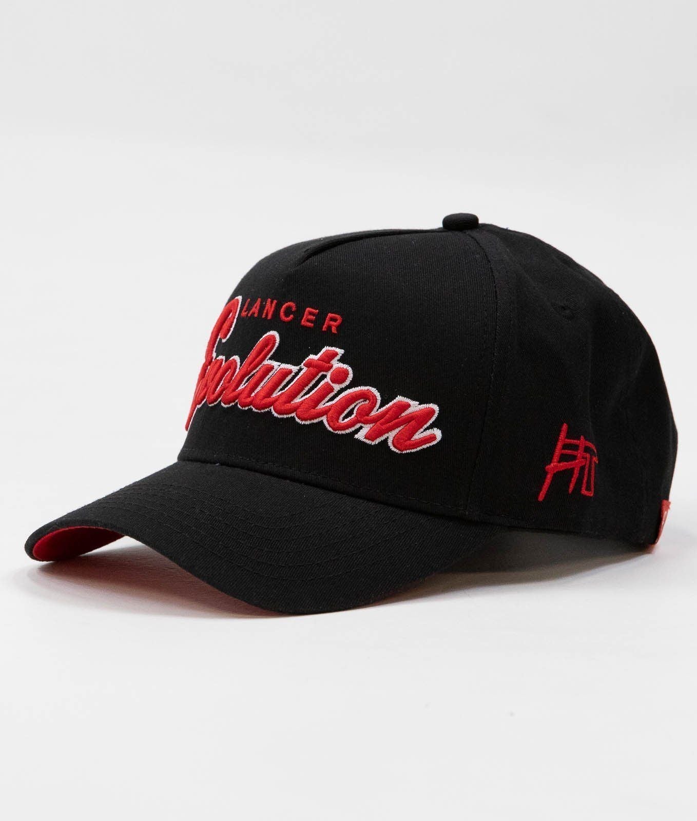 Months of prototyping and samples to perfect the fit of our latest style A-Frame Snapback caps, with pre-curved brim, and plenty of little details that set our caps apart from the rest. Featuring the Lancer Evolution tribute logo on the front and red under the brim, it's the perfect addition to any cap collector's stash.